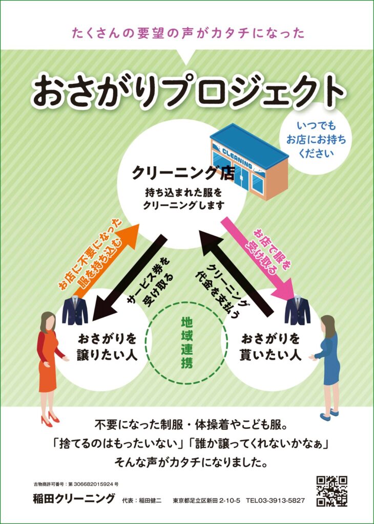 不要になった制服・体操着・子供服をきれいにクリーニングして、必要としている地元のご家庭にお譲りする、クリーニング店だからこそできる取り組みです。
